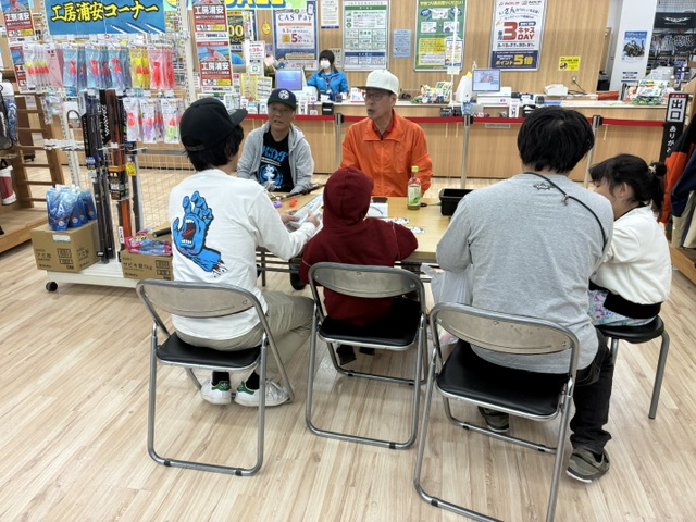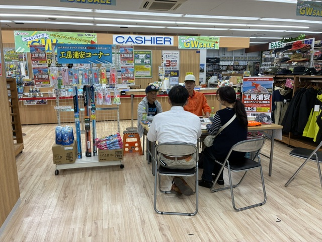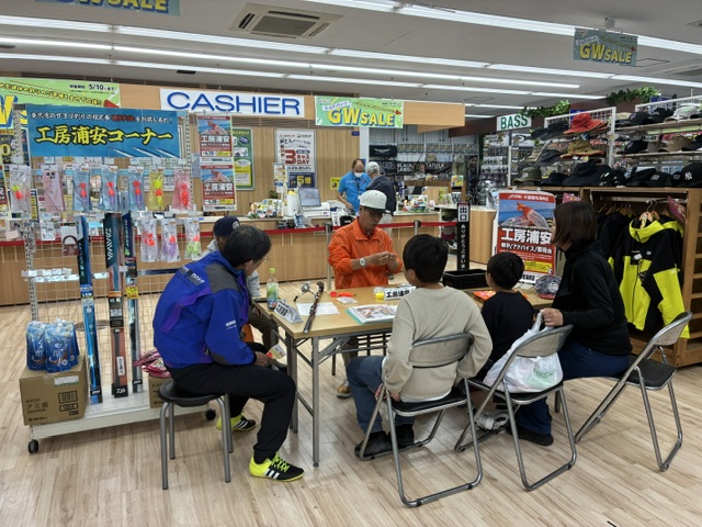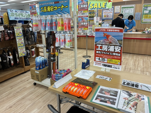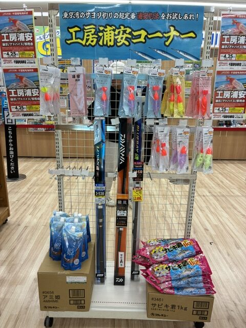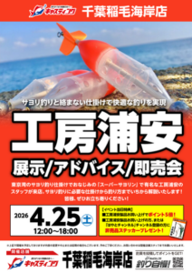 千葉稲毛海岸店様は、春サヨリ・秋サヨリの回遊がある検見川浜や千葉市周辺に近い大型店であり、今年も既に春サヨリの釣果があがっており、まさにこれからシーズン本番を迎える中でのイベント開催となりました。店内にはサヨリ商品の他、アジやハゼ釣り、キス釣り用品など工房浦安の製品も多数取り揃えていただいております。秋サヨリに続いてのイベント開催ではございましたが、サヨリ釣りを始めてみたいというお客様やベテランの方を含め多数のお客様にご来場をいただき、イベントは大変盛況でした。皆様のご来場に感謝いたします。改めて御礼申し上げます。